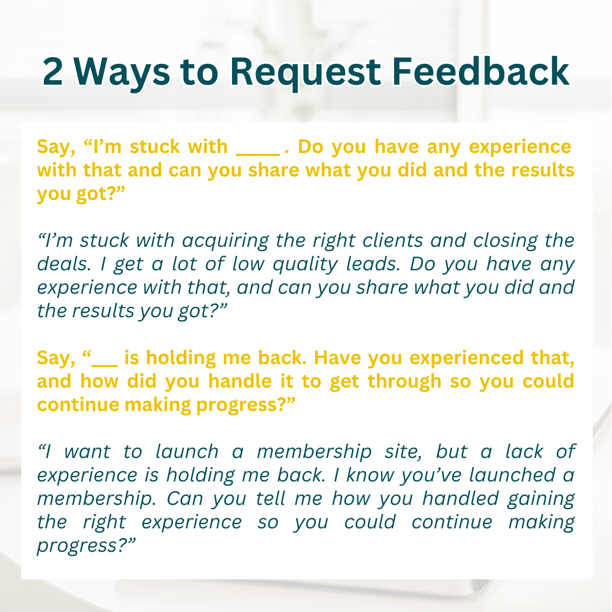 Be open to feedback: You don’t know what you don’t know, so approach your involvement with curiosity. Be mindful of any propensity to be defensive when discussing problems you struggle to solve.